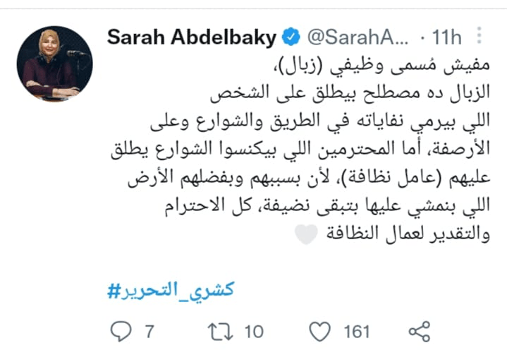 وعلق شخص تاني وقال: “في كل أنحاء العالم بيتم تكريمهم، وهم أهل للتكريم، وفي اليابان بيطلقوا على عامل النظافة لقب مهندس”. وعلقت سارة وقالت: “مفيش مسمى وظيفي “زبال” اسمه عامل نظافة، الزبال ده مصطلح بيطلق على الشخص اللي بيرمي نفاياته في الشارع، أما المحترمين هما اللي بيكنسوا الشوارع، واسمهم “عمال نظافة” لإنهم بينضفوا الأرض اللي بنمشي عليها”.