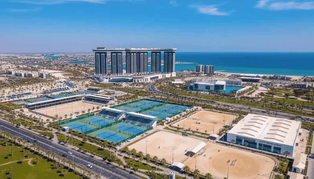 كما شمل المشروع أيضًا منشآت فندقية، ومراكز تأهيل ورياضي، ومرافق خدمية متكاملة لدعم استضافة البطولات الكبرى.