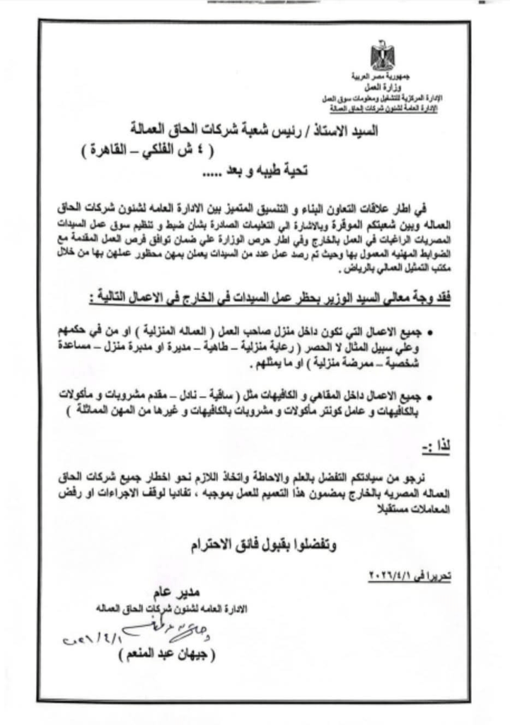 أصدرت وزارة العمل المصرية حزمة من التعليمات الصارمة التي تضمنت حظر سفر السيدات المصريات لبعض المهن في الخارج.
