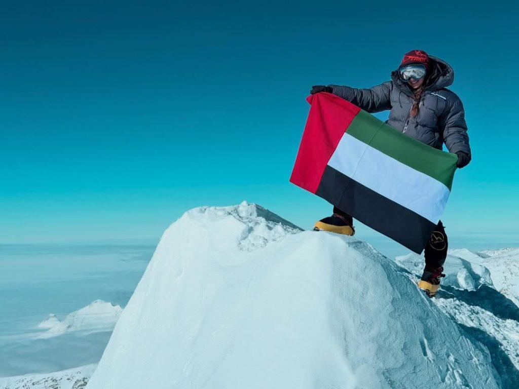 رفعت العوضي علم الإمارات شامخاً فوق السحاب، لتصبح رسمياً أول مراهقة وأصغر شابة عربية تكسر قيود البرد القارس وتعتلي القمة القطبية بنجاح.