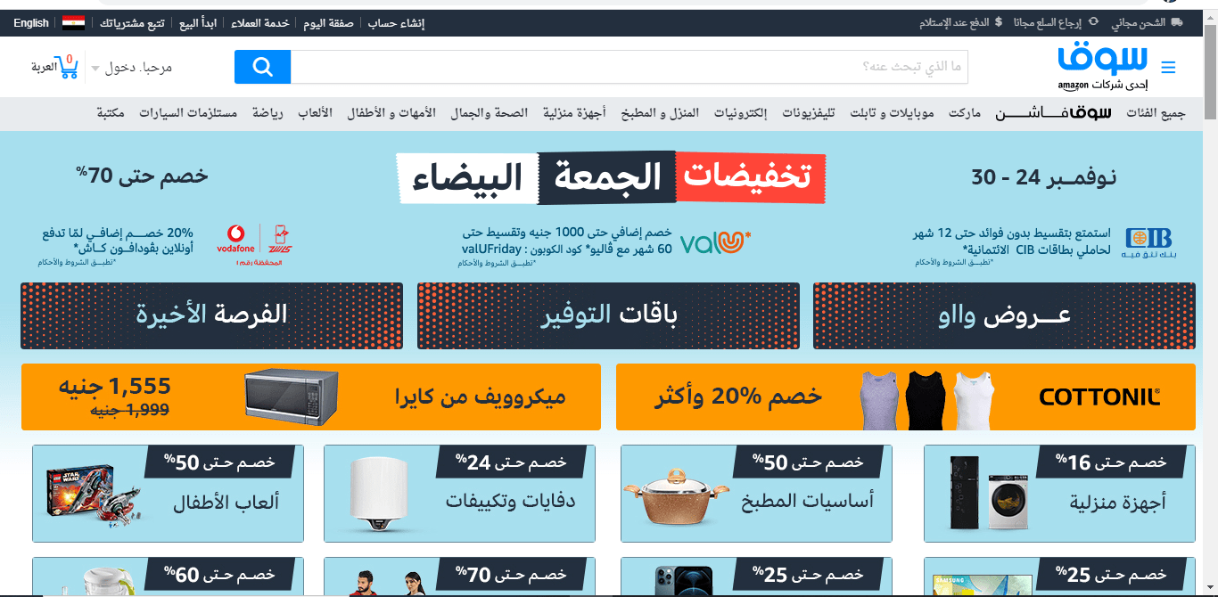 بخصومات لحد 70%، سوق بيقدم عروض مختلفة تقدروا تشوفوها على الموقع وتتسوقوا أونلاين في مصر، وعروض على كل المنتجات المختلفة تقدروا تستفيدوا منها قبل يوم 30 نوفمبر.