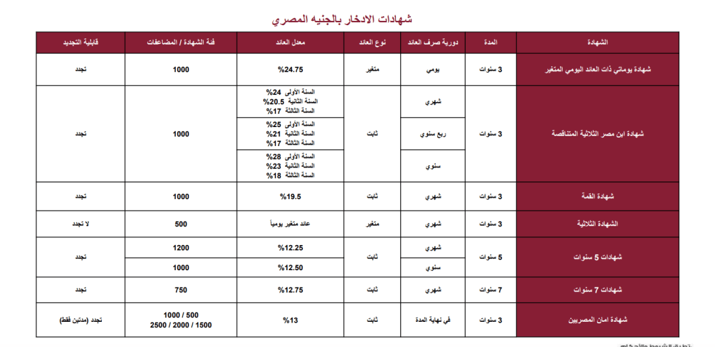 عائد متغير شهري قد يصل إلى 26% لمدة 3 سنوات، بحد أدنى للشراء 1000 جنيه ومضاعفاته.