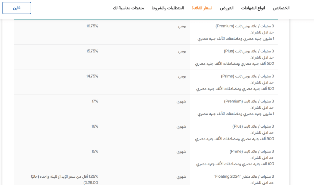وتوفر شهادة Premium عائدًا يوميًا يصل إلى 16.75% لمدة 3 سنوات، بحد أدنى للشراء مليون جنيه.