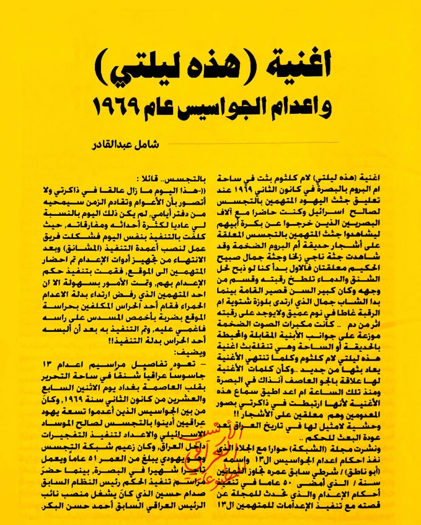 وفقًا للأرشيف العراقي عاش سكان مدينة البصرة في كانون الثاني من عام 1969 تجربة نفسية فريدة، حيث اجتمع مشهد الإعدام العلني مع طرب أم كلثوم.