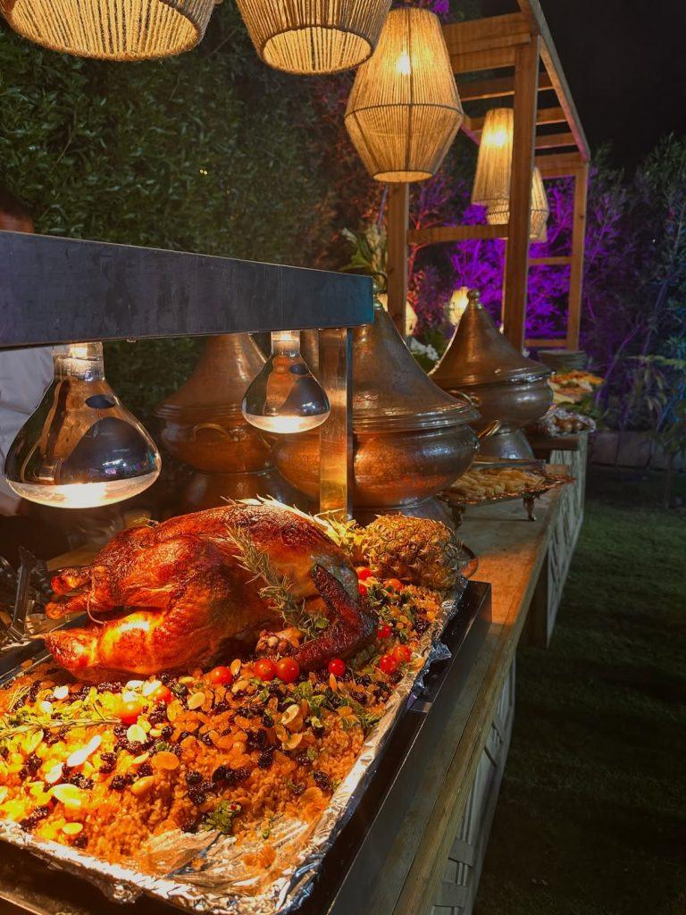 أما بوفيه الـ 35 شخص (90,000 جنيه)، فيشمل دجاج مغربي، روست بيف، سلمون تورنادو، وحلويات مثل البافلوفا والبروفيترول.