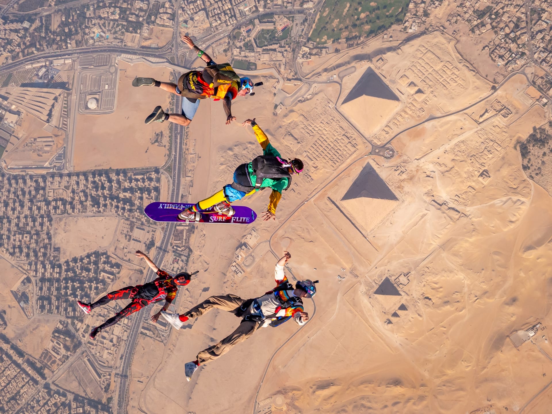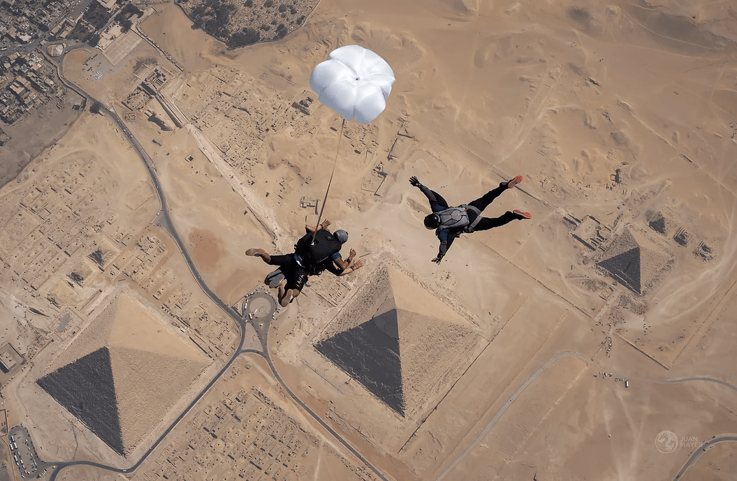 تقدم Skydive Egypt تجربة القفز الثنائي فوق أهرامات الجيزة، والتي تعرف باسم “القفز فوق الفرعون”.