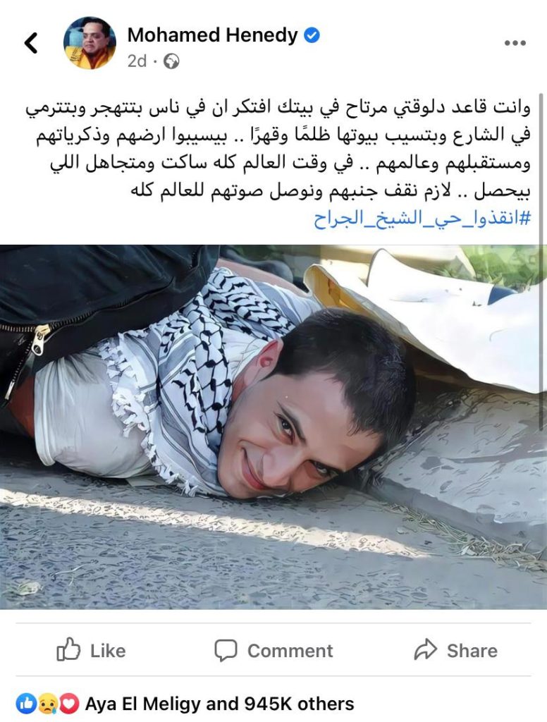 الفنان محمد هنيدي كان من أوائل الفنانين اللي يظهروا دعمهم لفلسطين وتصدر الترندات لما اتكلم عن أزمة الفلسطينيين اللي مجردين من أبسط حقوقهم إنهم يحتفظوا ببيوتهم من الطفولة ويعيشوا فيها بسلام وأمان.