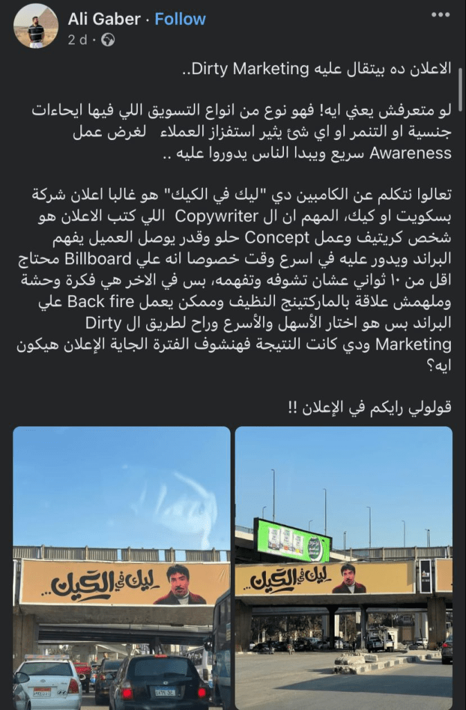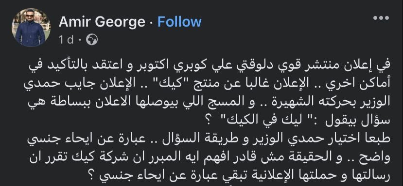 لوحات إعلانية ضخمة لإحدى شركات الحلوى منتشرة في عدد من شوارع القاهرة الكبرى، يبدو الأمر عاديًا ولكن إذا قرأت الجملة الإعلانية المصاحبة لها “ليك في الكيك”، وبجانبها صورة حمدي الوزير بنظرته الشهيرة من فيلم قبضة الهلالي التي اتخدها الناس “أيقونة للتحرش” وقتها لم يصبح الموضوع عاديًا ومن ثم بدأت سيل من الانتقادات.