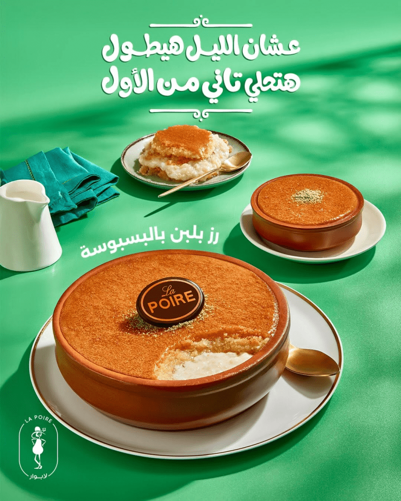 استغل La Poire ليالي رمضان الطويلة ليقدم مزيج الأرز باللبن مع البسبوسة، معززاً مكانته الرائدة في طرح ابتكارات البسبوسة في حلويات رمضان 2026.