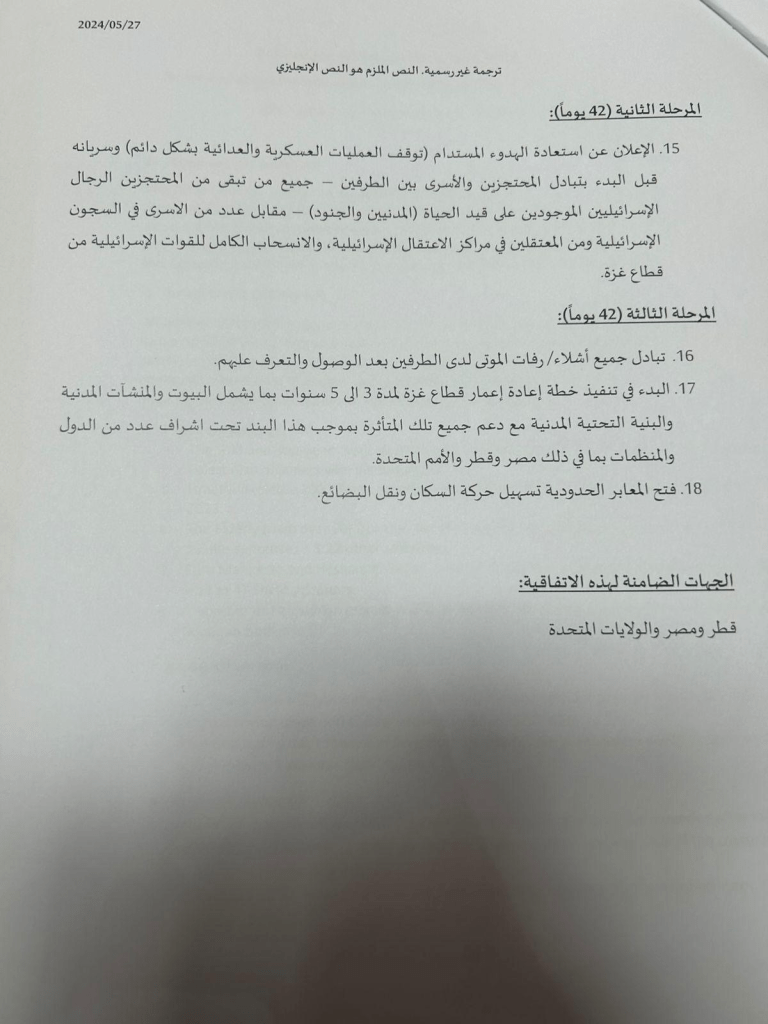 تشهد هذه المرحلة توقفًا دائمًا للعمليات العسكرية من جميع الأطراف، بما في ذلك إنهاء كافة الأعمال العدائية في جميع مناطق قطاع غزة.