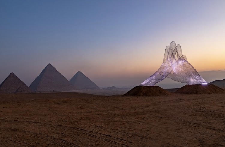معرض فني عالمي احتضنته الأهرامات، بيقوم فيه الفنانين بعرض أعمالهم في وسط الصحرا، المعرض من تنظيم “آرت دي إيجيبت” وهي شركة بتهدف لترويج الفن المصري القديم وخاصة تراث الفراعنة ،من خلال تنظيم معارض في المواقع التاريخية اللي تذخر بها مصر. وحضره عدد من الفنانين والمشاهير العالميين، زيّ المغني فاريل ويليامز، وألكسندر بونوماريف من روسيا، وجيزيلا كولون (بورتوريكو)، وجواو تريفيسيان من البرازيل، وشوستر وموسلي من المملكة المتحدة، وستيفن كوكس آر إيه من المملكة المتحدة، وقالت مؤسسة فنون مصر” آرت دي إيجيبت”، نادين عبد الغفار، إنها “المرة الأولى في تاريخ هضبة الجيزة الممتد على مدار 4500 عام، اللي تم فيها دعوة فنانين معاصرين من جميع أنحاء العالم لعرض أعمالهم مع الخلفية الأثرية لأهرامات الجيزة.