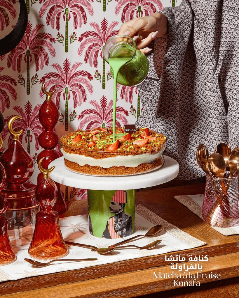 تتدم “تورتينا” هذا العام مزيجاً يجمع بين عبق اليابان وحلاوة الشرق، حيث تلتقي الكنافة المقرمشة مع كريمة الماتشا الغنية وقطع الفراولة.
