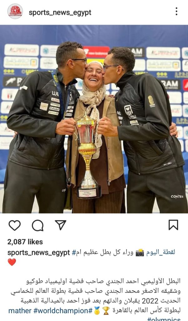 وفي لقطة مميزة بعد تتويجه، التقطت عدسات الكاميرا صورة له ولأخوه محمد الجندي، وهو لاعب أوليمبي له بطولاته، مع والدتهم، والمعروف عنها إنها دايمًا بتشاركهم لحظات نجاحهم وبتبقى حريصة إنها تبقى موجودة في كل البطولات علشان تدعمهم، لدرجة إنها صرحت قبل كده إنها استقالت من شغلها علشان تساعد ابنها في التمرين وتأهله للأولومبياد.
