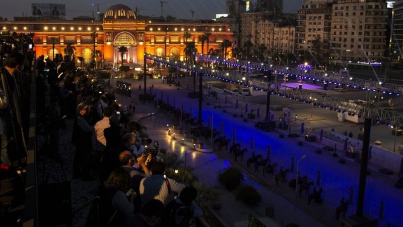 ما بين موكب ملكي ضخم وحفلات موسيقية أوبرالية باللغة المصرية القديمة، ورقصات وشعائر جنائزية من التاريخ المصري القديم، شيعت مصر ملوكها الـ 22 من المتحف المصري اللي كان مثواهم لـ 100 سنة، لمثواهم الجديد، وانتهى الموكب بإطلاق حرس الشرف 21 طلقة تحية لملوك مصر من أمام المتحف القومي للحضارة بالفسطاط، جنوب القاهرة.