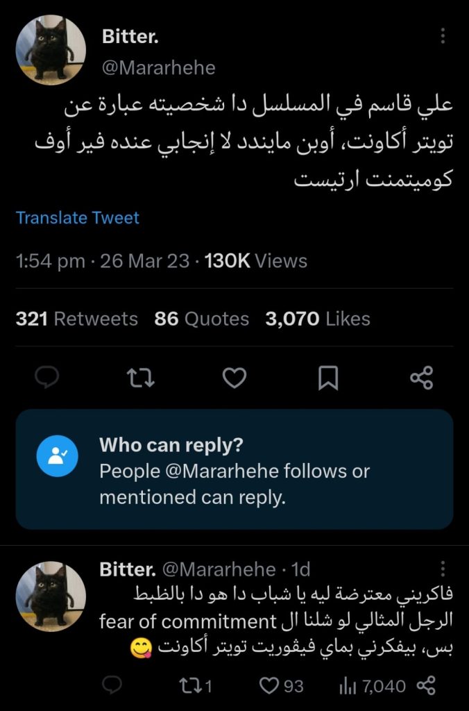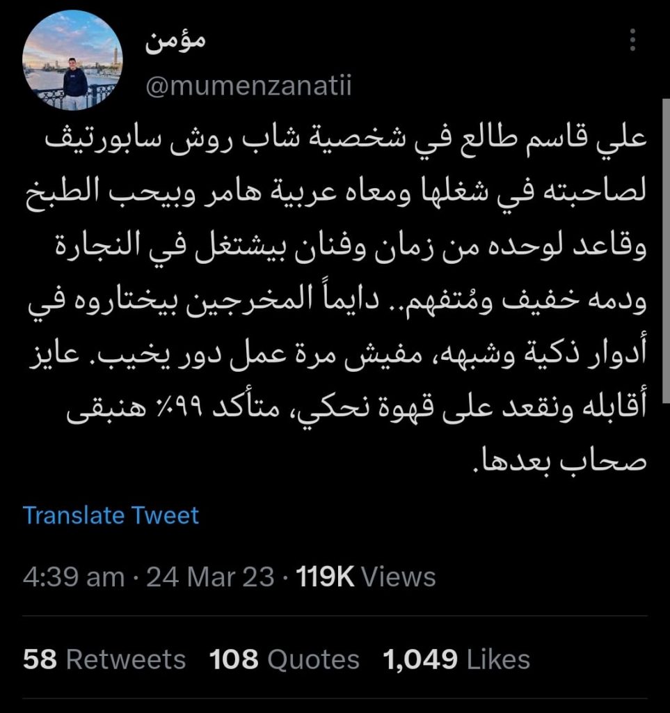 وده اللي أشار إليه مؤمن في تويت: “علي قاسم طالع في شخصية شاب روش بيدعم صاحبته في شغلها.. ودمه خفيف ومُتفهم. دايمًا المخرجين بيختاروه في أدوار ذكية وشبهه، مافيش مرة عمل دور يخيب”.