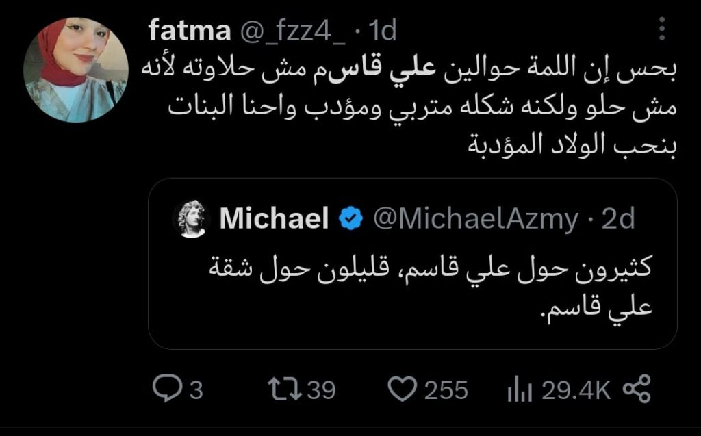 إعجاب الجمهور بشخصية شريف مش لمجرد كونه شاب وسيم وشيك، وده اللي وضحته فاطمة: “بحس إن اللمة حوالين علي قاسم مش حلاوته، ولكن شكله متربي ومؤدب، واحنا البنات بنحب الولاد المؤدبة”.
