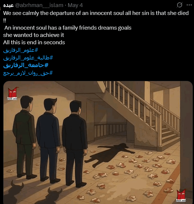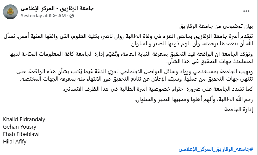 نعت جامعة الزقازيق الطالبة روان ناصر، مقدّمة التعازي لأسرتها وزملائها في كلية العلوم.