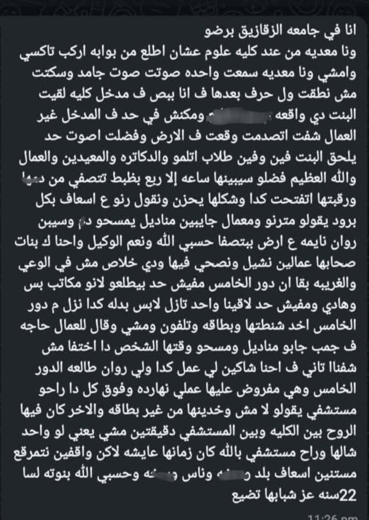 شهود العيان يروون تفاصيل مؤلمة حول حادثة وفاة طالبة الزقازيق: تأخر الإسعاف ومنع إنقاذها