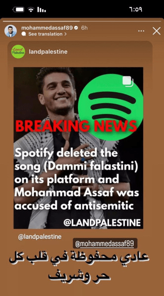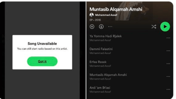 انتشرت أخبار عن حذف منصة (سبوتيفاي) و(أبل ميوزك) للموسيقى والتدوينات الصوتية لأغنية الفنان الفلسطيني محمد عساف (دمي فلسطيني)، بدعوة إن الأغنية تمثل “معاداة السامية”.