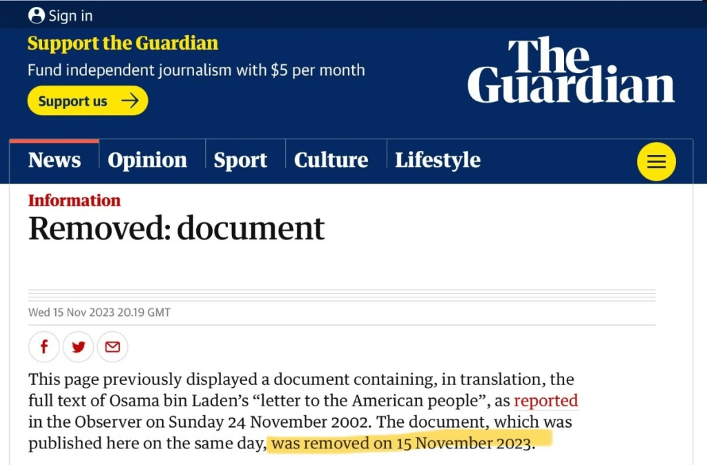 إعادة نشر الرسالة جاء كنوع من التفاعل مع إرسال المساعدات العسكرية الأمريكية لجيش الاحتلال الإسرائيلي، وقد كانت الرسالة تضع المساعدات الأمريكية للاحتلال الإسرائيلي لفلسطين، كأشد المبررات لهجوم 11 سبتمبر، ومع هذا التفاعل الأمريكي سارعت صحيفة الجادريان البريطانية لحذف نص الرسالة من موقعها.