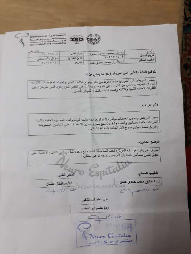 وقالت “اللي عرفته بعد كده إن الترامبولين كان ارتفاعها أقل من متر وده لا مش متناسب لا مع طول ابني ولا وزن ابني”.. يوسف دلوقتي محتاج يكمل علاجه الطبيعي على الأقل لمدة سنة كاملة وبتكلفة توصل لمليون و800 ألف جنيه. محتاجين نوصل صوته للمسئولين علشان يتعالج ويرجع تاني أحسن من الأول.