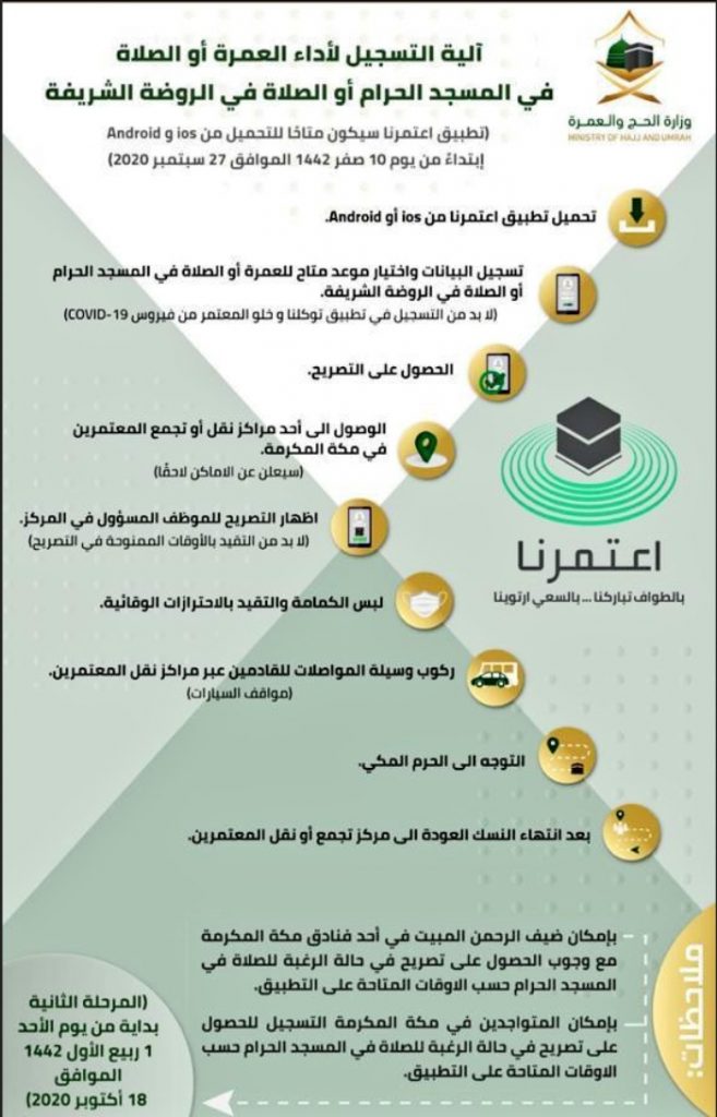 أكدت وزارة الحج والعمرة أنهم حرصوا على إمكانية أداء العمرة بشكل آمن، وعملت تطبيق اسمه “اعتمرنا” بالتعاون مع الهيئة السعودية للبيانات والذكاء الاصطناعي، والتطبيق ده مخصص لتنظيم حجز ودخول المعتمرين والمصليين، وده من ضمن التدابير اللي خدوها للوقاية من الوباء، وهيكون متاح للتنزيل على الأجهزة الذكية من يوم 27 سبتمبر 2020 على أنظمة الـ Android، والـ iOS. وكمان أكدت الوزارة على أهمية الإتزام بالإجراءات والتعليمات زي ارتداء الكمامات، والتباعد، وعدم التلامس، والتعقيم المستمر.