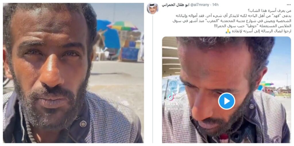 ناس كتير من الوطن العربي نشرت الفيديو على أمل التعرف على الشاب والوصول لأهله، والتأكد من كونه مواطن سعودي فعلًا ولا لأ، لإنه واضح عليه علامات فقدان الذاكرة، وحصل مناشدات لمساعدته من السفارة السعودية والتعرف عليه، وفعلًا السفارة اتدخلت وأمير منطقة الباحة، الأمير حسام بن سعود، وجه أوامر للوصول للشاب السعودي والبحث عن أهله والتنسيق مع الجهات الحكومية المغربية والسعودية علشان يتم إنقاذه.