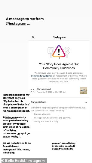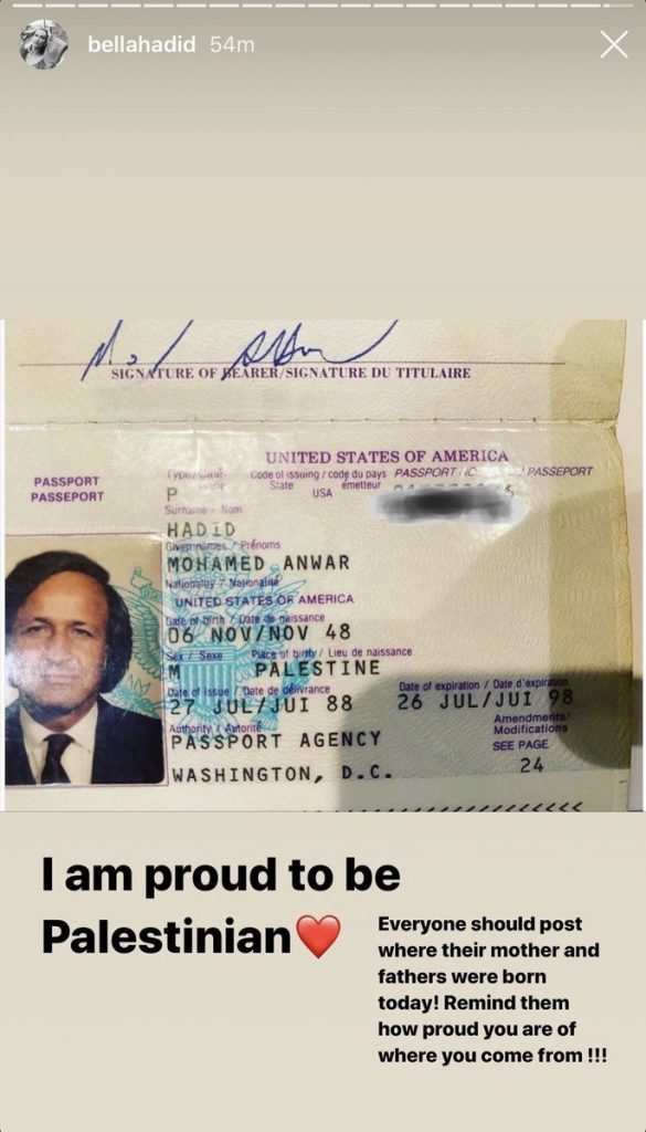بعد ما نشرت عارضة الأزياء من أصل فلسطيني بيلا حديد ستوري علي موقع إنتسجرام فيها صورة لجواز سفر والدها رجل الأعمال المشهور محمد حديد وظهر فيها محل ولادته “فلسطين”، إتفاجئت إنها اِتشالت من غير سابق إنذار من على الموقع والسبب كان: “مخالفتها القواعد و القوانين الخاصة بالتطبيق”.