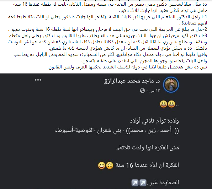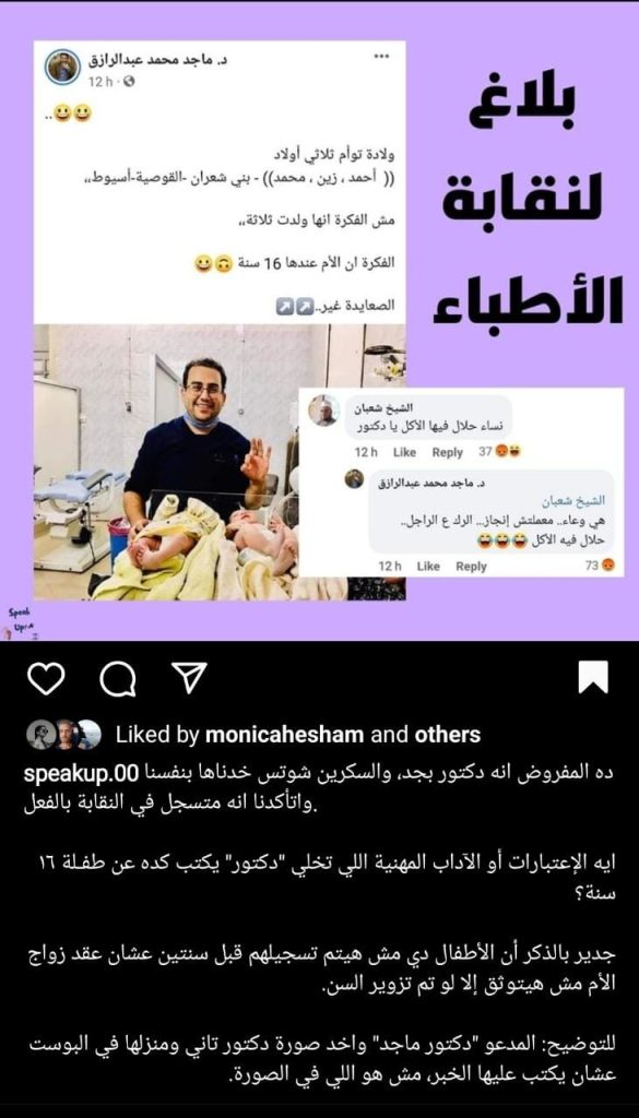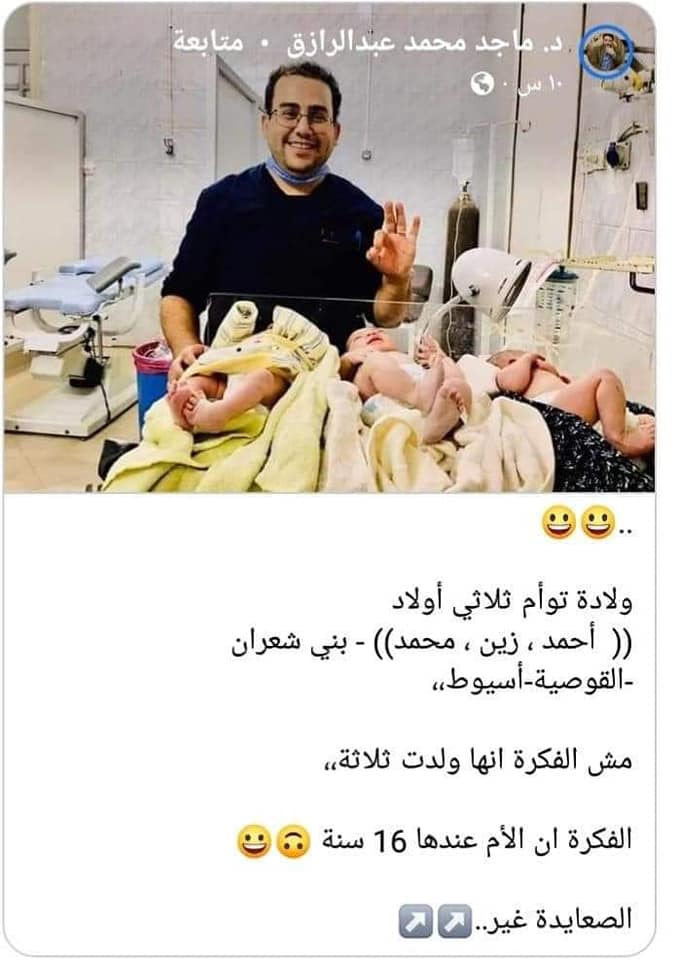 ولادة توأم ثلاثي كانت سبب في مطالبات بالتحقيق مع الدكتور اللي قام بتوليد الأم “الطفلة”، انتشر على فيسبوك صور من صفحة دكتور نسا، والصور من ولادة توأم ثلاثي والدكتور كاتب عليها إن والدتهم عندها 16 سنة، وبيرجع الفضل في ده لإنهم صعايدة، ومن الواضح إنه بيشجع على زواج القاصرات وبيعتبره إنجاز.