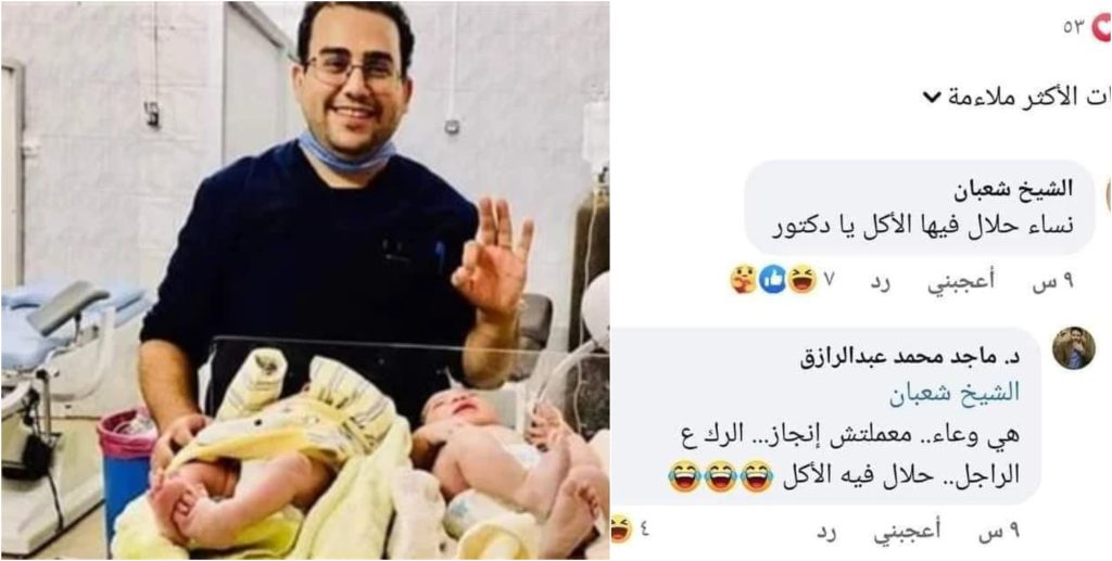 الموضوع ماخلصش لحد الصورة والتعليق عليها، لكن في شخص كمان علّق وقال: “ستات حلال فيها الأكل” فالدكتور المحترم رد عليه وقاله إن الست مجرد وعاء، ماعملتش إنجاز.. الراجل هو اللي حلال فيه الأكل.