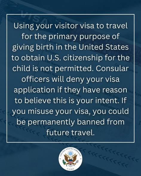بالإضافة إلى ذلك، فإن السفارة الأمريكية بالقاهرة تحذر من زيارة الولايات المتحدة من أجل الولادة والحصول على الجنسية لتجنب المنع المستقبلي.