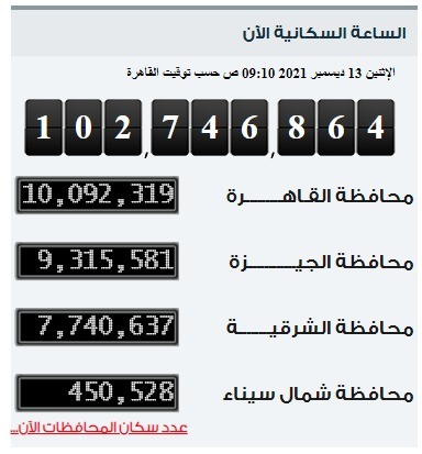 الساعة السكانية التابعة للجهاز المركزي للتعبئة العامة والإحصاء، واللي موجودة في كذا موقع في القاهرة، أعلنت من كام ساعة عن وصول عدد سكان مصر لـ 102 مليون و746 ألف مواطن في الداخل، وبكده بيكون تعداد السكان في مصر دخل الربع مليون التالت بعد المليون رقم 102.