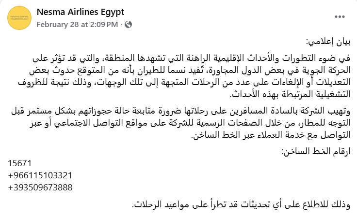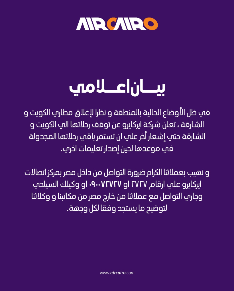 - الإجراء الحالي: توقف الرحلات إلى (الكويت والشارقة) فقط حتى إشعار آخر، مع انتظام باقي الرحلات المجدولة.