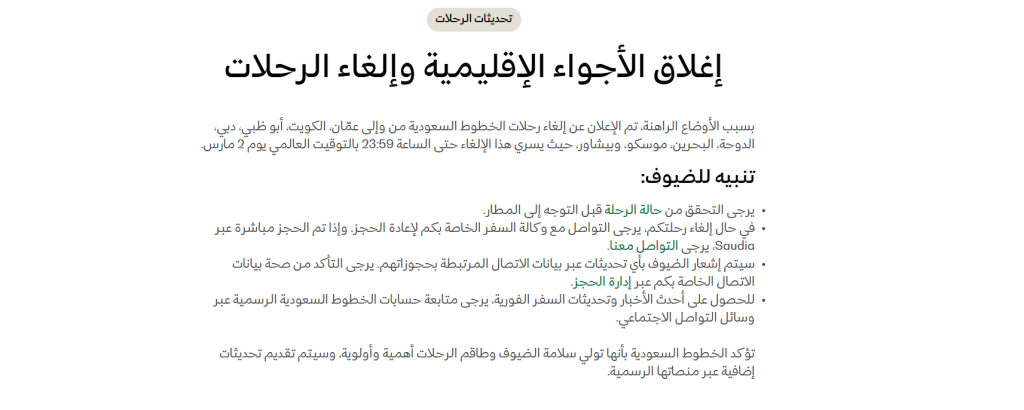 - الإجراء الحالي: تعليق الرحلات لبعض الوجهات الدولية حتى الساعة 12:00 ظهراً بتوقيت المملكة يوم 3 مارس 2026.