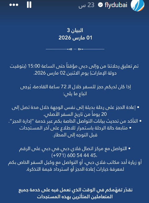 - حالة الرحلات: تعليق الرحلات من وإلى دبي حتى الساعة 15:00 بتوقيت الإمارات يوم الاثنين 2 مارس.