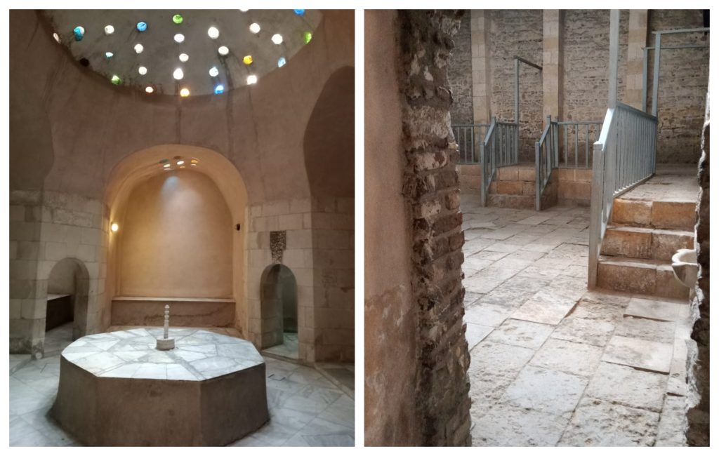 أما بالنسبة لوصف الحمام، فهو عمره أكتر من 700 سنة، مدخله الرئيسي بيأدي لطريق منكسر علشان اللي برا مايشوفش اللي جوا، في الأول هتقابل غرف لتغيير الملابس بتغير فيها هدومك، وبعدها بتسلمها وبتسلم مقتناياتك في الأمانات، وبتستلم معاها قبقاب وبشكير، وبعدها بتطلع على الغرف الدافئة للتدليك والمساج والغرف السخنة للاستحمام، والمياه كانت بتتيجي من خلال فتحات من سوق مجرى العيون.