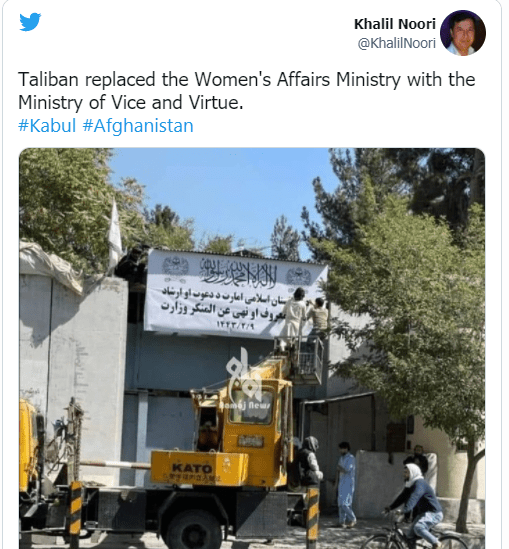 ولسه الانتهاكات مستمرة ضد المرأة الأفغانية بعد وصول طالبان للحكم، وكان آخر الانتهاكات دي هي استبدال أو معنى أصح “إلغاء” وزارة شئون المرأة، وبقى مكانها وزارة الأمر بالمعروف والنهي عن المنكر، وده بعد ماشافوا الناس هناك إنه تم استبدال اليافطة اللي مكتوب عليها “وزارة شئون المرأة” بيافطة مكتوب عليها “جماعة الأمر بالمعروف والنهي عن المنكر”.