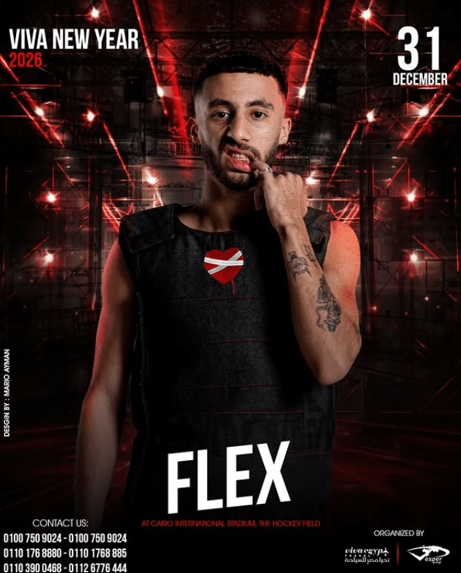 يختتم النجم الصاعد Flex عام 2025 بأداء قوي على ملعب الهوكي في Cairo International Stadium يوم 31 ديسمبر ضمن حفلات رأس السنة في مصر.