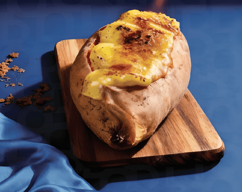 البطاطا الحلوة تشوى حتى تصبح طرية، وتملأ بسكوب من الجيلاتو الكريمي، مع صوص سولتد كاراميل غني ينساب على الجوانب.