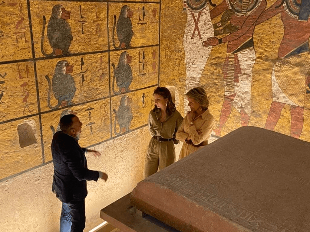 وأوضح وزيري إن الزيارة شملت أماكن عمل البعثات البلجيكية في الكاب ودير المدينة ومقابر الأشراف، بالإضافة لمقبرة الملك توت عنخ آمون بوادي الملوك، وقام الدكتور مصطفى وزيري بشرح تاريخ المقبرة وقصة اكتشافها على إيد عالم الآثار هيوارد كارتر عام 1923، واللي شاركت الملكة إليزابيث في الافتتاح الرسمي لها من زمن بعيد.