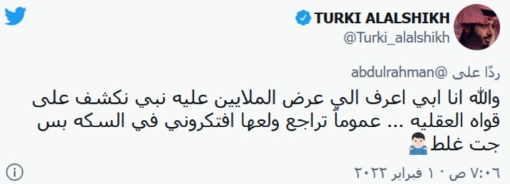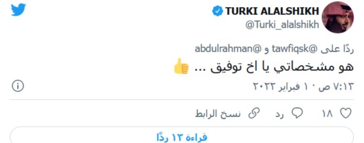 ورد عليه تركي آل الشيخ نصًا “والله أنا أبي أعرف اللي عرض الملايين عليه. نبي نكشف على قواه العقلية.. عموماً تراجع ولعها افتكروني في السكة بس جت غلط”. ورد على تغريدة للشاعر توفيق الخليفة هاجم فيها محمد صبحي “هو مشخصاتي يا أخ توفيق”.