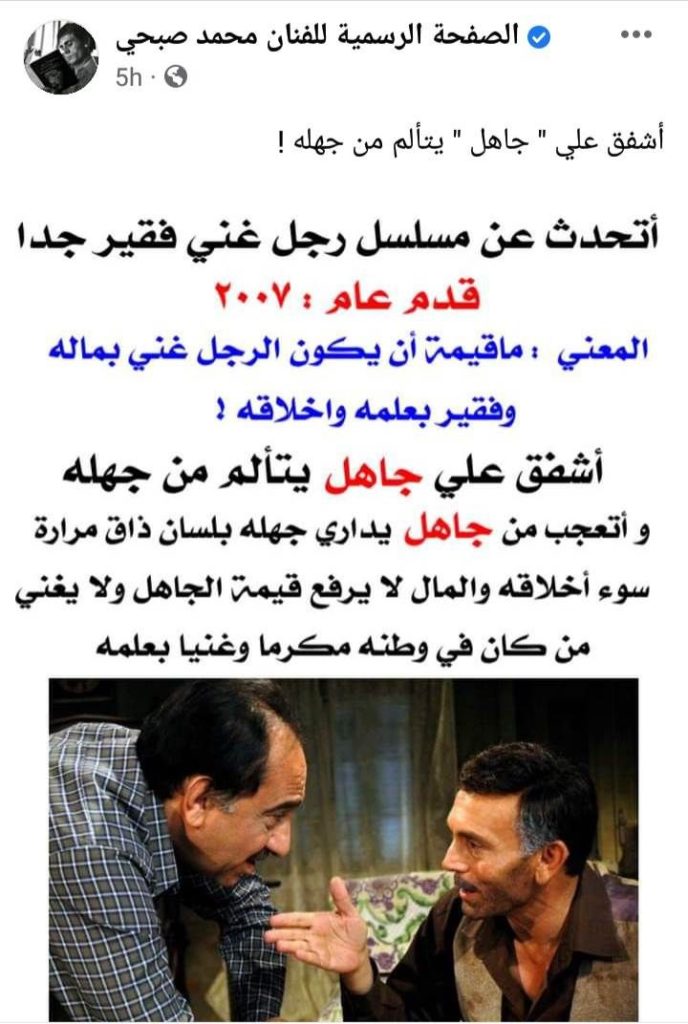 وبعدها نزل محمد صبحي على صفحته بوست الناس اعتبرته رد على اللي قاله تركي بس من غير ما يوجه كلامه بشكل مباشر وقال “أشفق على جاهل يتألم من جهله”