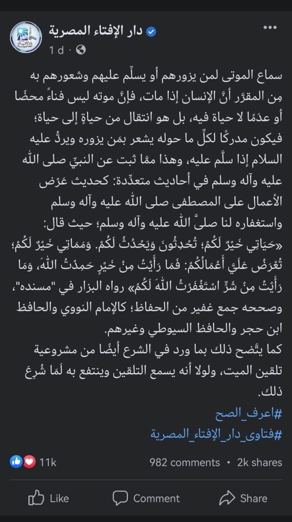 وقالت دار الإفتاء من خلال صفحتها على الفيسبوك، اللي بيتابعها أكتر من 12 مليون متابع : “مِن المقرَّر أنَّ الإنسان إذا مات، فإنَّ موته ليس فناءً محضًا أو عدَمًا لا حياة فيه، بل هو انتقال من حياةٍ إلى حياة؛ فيكون مدركًا لكلِّ ما حوله يشعر بمَن يزوره ويردُّ عليه السلام إذا سلَّم عليه”.