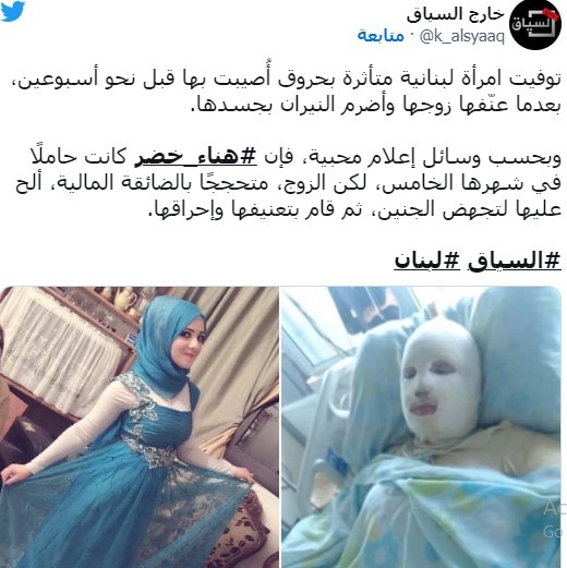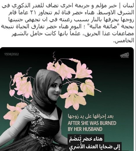 في حادثة توجع القلب هزت الوطن العربي ولبنان، هناء الخضر زوجة شابة عايشة في شمال لبنان عمرها 21 سنة اتوفت بعد بإصابتها بحروق ماقدروش يسيطروا عليها غطت جسمها كلها، والسبب هو جوزها بعد مارفضت إنها تجهض ابنها، فسابت الحياة بعد 11 يوم من نقلها للمستشفى وسابت طفلين بعد جواز استمر خمس سنين، والجنين اللي كانت حامل فيه اتوفى داخل رحمها وهو عمره خمس شهور وكانت محتاجة وقتها لعملية جراحية.