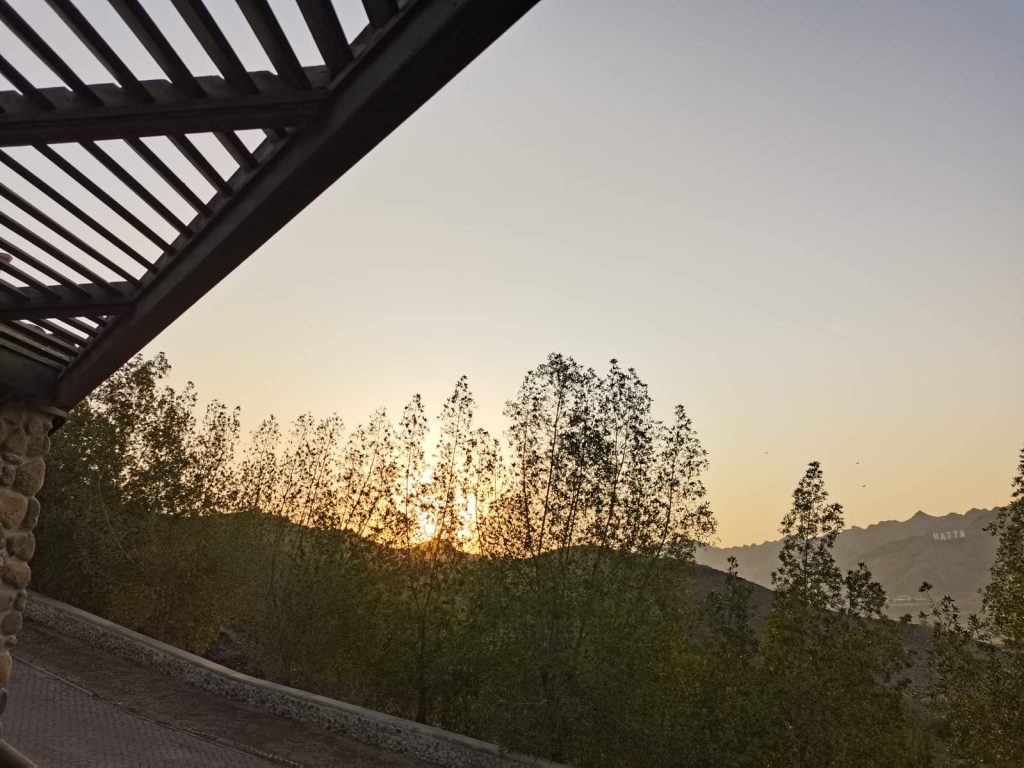 رغم إني كنت مرهق جدًا من السفر ونمت الساعة 12 بالليل، صحيت الساعة 6 الصبح لقيت إني نسيت الستاير مفتوحة، وشوفت منظر خيالي للشمس بتشرف من ورا الجبل وأشجاره، وقمت أشرب القهوة وأتفرج على المنظر الجميل ده.