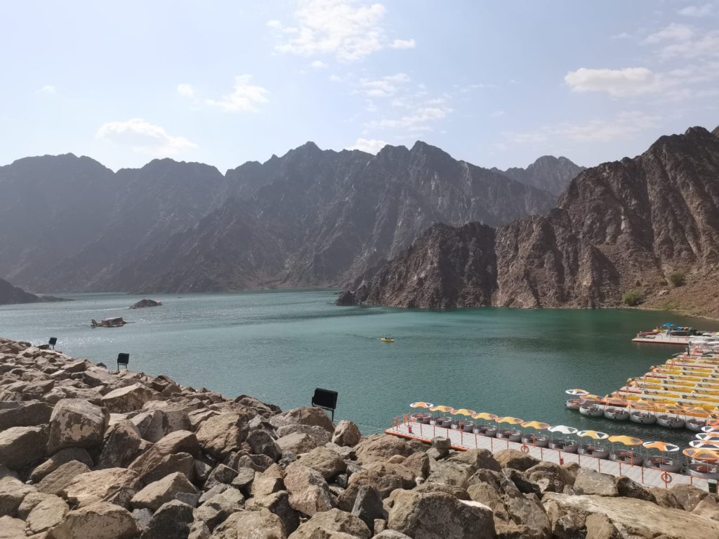 أخدنا العربيات بعد الفطار وطلعنا على مركز تجديف اسمه “حتا كاياك”، المكان حوالي خمس دقايق من الفندق، وهو عبارة عن وادي بين الجبال بتتجمع فيه مياه الأمطار والسيول وبيوصل عمق المياه فيه 25 متر، وتقدر تختار بين أنواع مختلفة من المراكب علشان تاخد واحد وتدخل تجدف به في البحيرة.