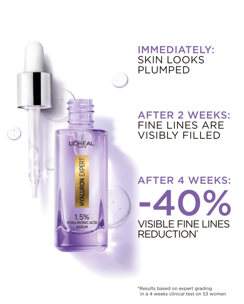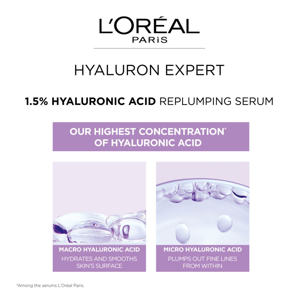 بيتميز سيروم هيالورون اكسبيرت من لوريال باريس بإنه بيحتوي على 1.5% من حمض الهيالورونيك، وقالت د. ريم إن النسبة دي أكبر من النسب الموجودة في السوق، وده بيميز السيروم لإنه بيسرع التأثير الإيجابي للمنتج.