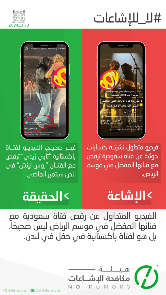 ولكن، بعد فحص الفيديو، تبين أنه يعود إلى حفل أقيم في لندن في سبتمبر الماضي، وليس في الرياض.