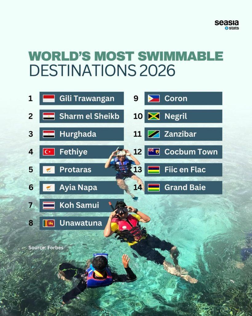 ومع تصدر المدن المصرية، شهدت جنوب شرق آسيا هيمنة واضحة على قائمة أفضل وجهات السباحة، حيث حصدت جزيرة Gili Trawangan المركز الأول عالميًا.
