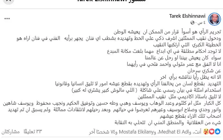 الناقد الفني طارق الشناوي أدلى بدلوه في هذا الجدل، حيث عبّر عن رفضه لفكرة تقييد الآراء الفنية، قائلاً: “تجريم الرأي هو أسوأ قرار يمكن أن يعيشه الوطن، ودخول نقيب الممثلين أشرف زكي على الخط وتهديده بشطب أي فنان يجهر برأيه الفني في فنان آخر أراه خطيئة كبرى”.